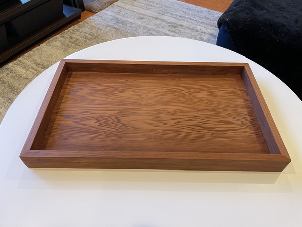 I decided to keep things simple and focus on the fit and finish of the tray. The design I came up with was straightforward: a miter box frame with a dado groove for the bottom panel. I spent several Saturdays in my garage milling, cutting, and recutting the parts. It took some work to get the miters just right. Then I sanded through the following grits: 80, 120, 220. I applied two coats of wipe on polyurethane to finish, sanding between and buffing afterwards.